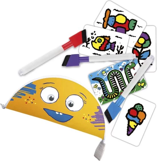 | Verpakkingsinhoud | Inhoud:, 55, kaarten, met, illustraties, 5, dubbelzijdige, scoringskaarten, 6, markeerstiften, met, sponzen, 1, buidel, De, spelregels |