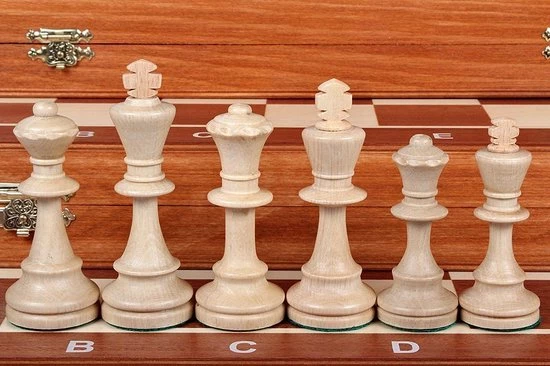 Koningshoogte: 10 cm. De witte vierkanten zijn gedrukt op het schaakbord. Het inklapbare schaakbord is gemaakt van mahonie- en plataanhout. Met een veldmaat van 58 mm en bijpassende stukken valt dit bord binnen de voorgeschreven richtlijnen van de FIDE (de wereldschaakbond). Een echt professioneel schaakspel!