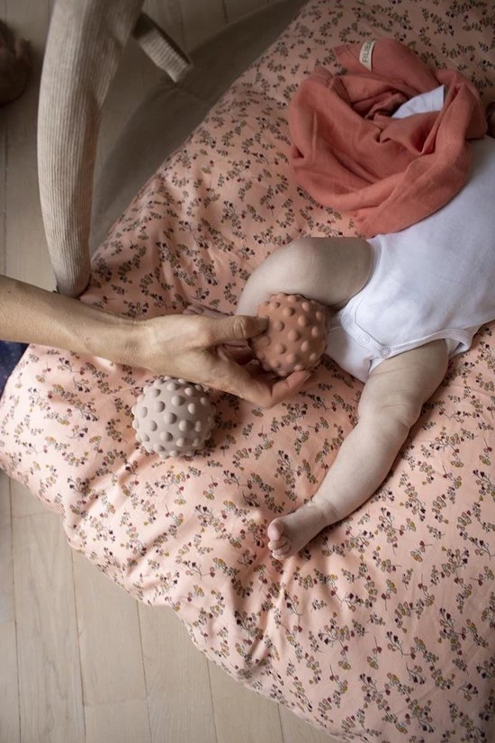 De motoriekballen zijn ontworpen voor de motorische ontwikkeling. Met het hart in al onze producten, hebben we een ballencollectie gecreëerd, met tactiele oppervlakken, goede eigenschappen en in fijne kleurschakeringen.De motor skills ballen zijn geproduceerd in 100% natuurlijk rubber en helpen de motoriek en grijpreflexen van het kind te stimuleren. Met een leuk zacht belletje binnenin, stimuleert het ook de gehoorzintuigen van de baby. Op het oppervlak zijn kleine deukjes aangebracht die ideaal zijn voor kinderen met sensorische behoeften of kinderen die gewoon een beetje zachte aanraking nodig hebben, tegelijkertijd zijn alle randen zacht, wat kan helpen bij pijnlijk tandvlees en tegelijkertijd stimulerend is voor de tastzintuigen. Geweldig product voor de ontwikkeling van de fijne motoriek van het kind.Aangezien de bal geproduceerd is in 100% natuurlijk rubber, kan de uitdrukking lichtjes variëren van zacht tot zacht.