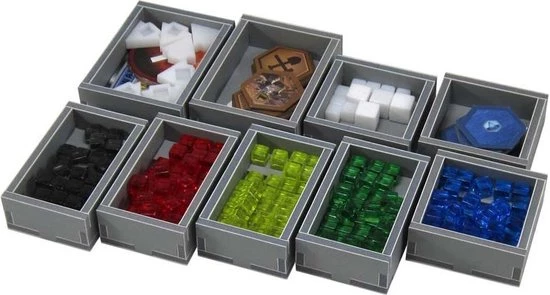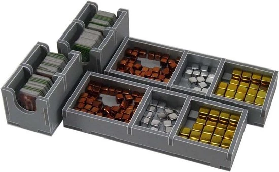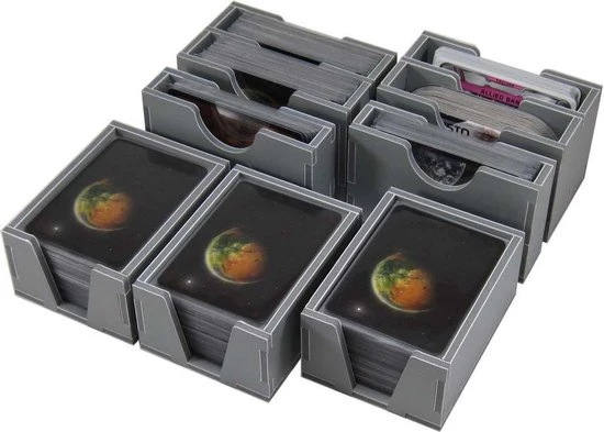 The design provides both efficient storage and improved game play. Many of the trays can be utilised during the game, and they greatly aid set-up and clear-away times. The boards and player boards act as a lid on top of the trays. There is space for all cards to be sleeved.