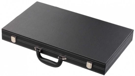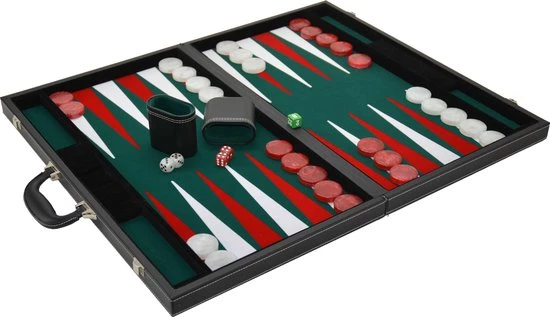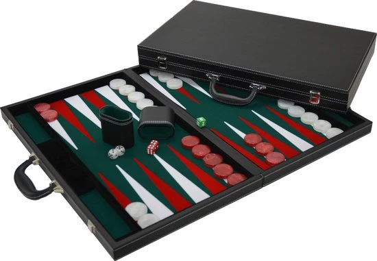 backgammonkoffer 53 cm xl de luxe casinomaat, luxe zwart kunstleder. Speelveld van groen velours, met ingelegde rode en witte punten diameter 38 mm.