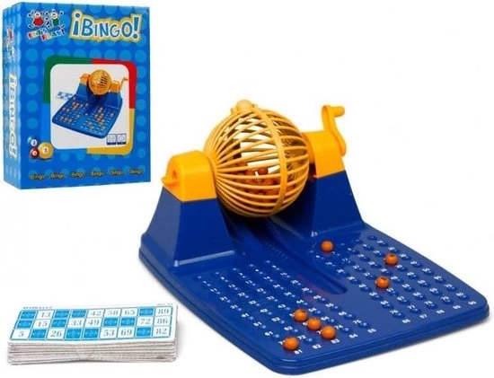 Bingo spel blauw/geel/oranje complete set 25 x 22 cm nummers 1-90 met molen, 148x bingokaarten en 2x stiften. Compleet bingospel, bestaande uit: een bingomolen met sorteerbord/controlebord, 90x oranje balletjes, 48x bingo speelkaarten, fiches en 2x bingostiften. De stiften hebben een platte punt waardoor u de genoemde getallen gemakkelijk kunt afstippen op uw kaart. U kunt de kaarten hergebruiken indien u de fiches er op legt in plaats van deze aan te strepen met de bingostift.