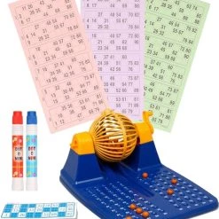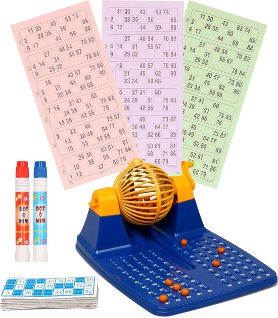 Speelgoed – Bingospel – Bingo/lotto/tombola spellen – Bingomolen met bingokaarten – Bingo spelen – Kinderspeelgoed – Gezelschap spellen – Bingomolen/bingowiel/bingotrommel – Bingodabbers/bingomarkers – Bingo voor kinderen en volwassenen. bestaande uit 1x 100x Bingokaarten nummers 1-90, 1x Bingostift rood, 1x Bingostift blauw, 1x Bingo spel blauw/geel/oranje complete set nummers 1-90 met molen en bingokaarten Let op: dit is geen speelgoed en niet geschikt voor kinderen.