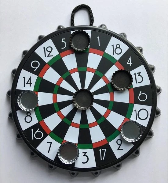 Bierdopjes dartbord. Gooi niet meer direct uw kroonkurken weg, maar gooi deze tegen het dartbord! Diameter: ongeveer 24 cm. Drankspellen/studentenspellen bierspel. Let op: dit is geen speelgoed en niet geschikt voor kinderen.