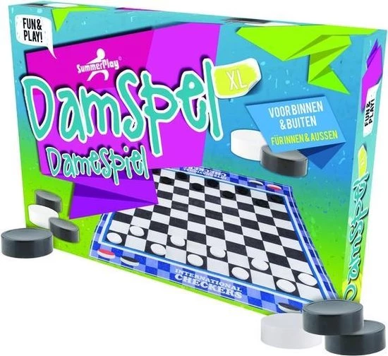 Dit extra grote damspel heeft een speelbord van 60 x 70 cm en houten spelstenen.