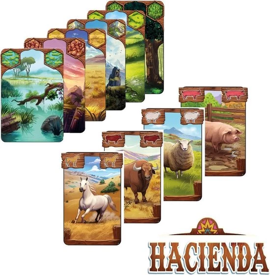 In Hacienda vechten de spelers om gebieden op de Zuid Amerikaanse pampa’s, om te proberen zoveel mogelijk vee naar de verschillende markten te brengen. Je krijgt drie acties per beurt om kaarten te kopen (om tegels te leggen voor landclaims of kuddes) of om extra zaken te kopen zoals waterpartijen en haciendas voor extra punten.