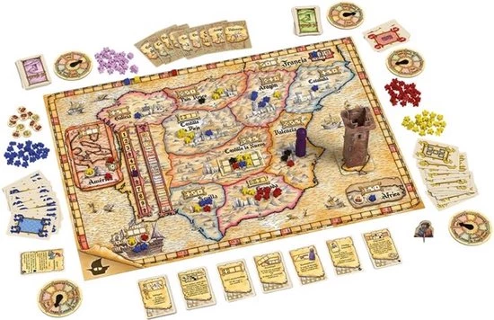 | Verpakkingsinhoud | Inhoud:, 1, dubbelzijdig, speelbord, 1, Castillo, 1, rondeteller, 346, kaarten, 2, scoretegels, 5, Grandes, 180, caballero’s, 5, scorestenen, 1, Koning, 5, kiesschijven, met, wijzers, 1, startspelerfiguur, 5, vaandels, 4, caballero’s/huurlingen, 11, goederen, 5, goud, 12, fiches, 2, schepen, Portugal, 1, gevangenis, 4, begrenzingstableaus, 1, brug, De, spelregels |